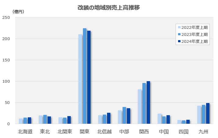 地域別に見ると北海道・北関東・神奈川・北信越・関西・中国・四国・九州で増加しており、中でも伸び率の大きかった地域は北関東の前年度比122%、北信越の119%、四国の117%、中国の116%であり、この地域での市場拡大が改装市場の牽引に貢献していると考えられる。